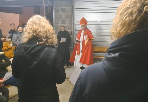 Über den Gärtlesrain erreichte die Wanderschar anschließend das Haus von Fam. Bacher. Dort wartete der Nikolaus dieses Mal wetterbedingt nicht wie sonst auf der Terrasse, sondern in der Garage. Er freute sich sehr, wieder so viele Kinder und Erwachsene begrüßen zu können. Nach einem gemeinsam gesungenen Lied erzählte der Nikolaus in der Geschichte vom Schlamper-paule, dass auch der Nikolaus manchmal ein echter Schlamper ist. Nachdem er die Erwachsenen mit „Mir schenke uns nix“, einem Liedtext der A-cappella-Band Viva Voce, ebenfalls angesprochen hatte, verteilte der Nikolaus Geschenkpäckle an die anwesenden Kinder und Jugendlichen. Danach ließen Klein und Groß die Wanderung bei Punsch, Glühwein und Gebäck frohgelaunt ausklingen.