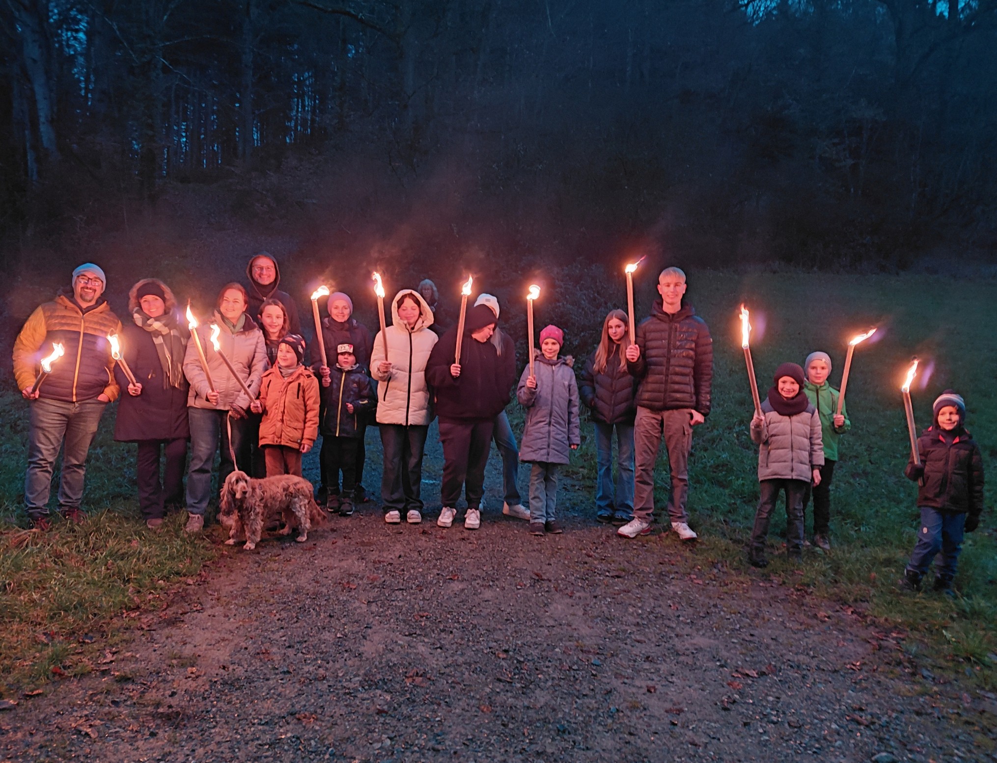 Zum Abschluss des Familienwanderjahres trafen sich, trotz des regnerischen Wetters, über 30 kleine und große Wanderer am Wanderparkplatz Kreuzackerstraße zur traditionellen Nikolauswanderung.  Der Weg führte zu-nächst ein Stück die Eichendorffstraße hinunter bis zum Abzweig ins Arboretum. Dort wurden die mitgenom-menen Fackeln angezündet und es ging bei gespenstischem Fackelschein am Arboretum vorbei durch den Wald zum Bartenbacher Weg.