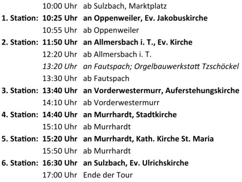 Auch Interessenten an klassischer Orgelmusik, die nicht mit Radfahren möch-ten oder können, sind herzlich eingeladen, sich zu den angegebenen An-kunftszeiten an den jeweiligen Kirchen einzufinden.