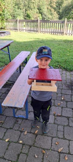Erhard Schirrmeister hatte dazu 30 Bausätze eines einfachen Vogelfutterhauses vorbereitet. Nach etwas zögerlichem Beginn wagten sich dann immer mehr kleine Handwerker*innen an die Akkuschrauber und schraubten mit großer Begeisterung sowie mit mehr oder weniger Unterstützung ihr eigenes Futterhaus zusammen.