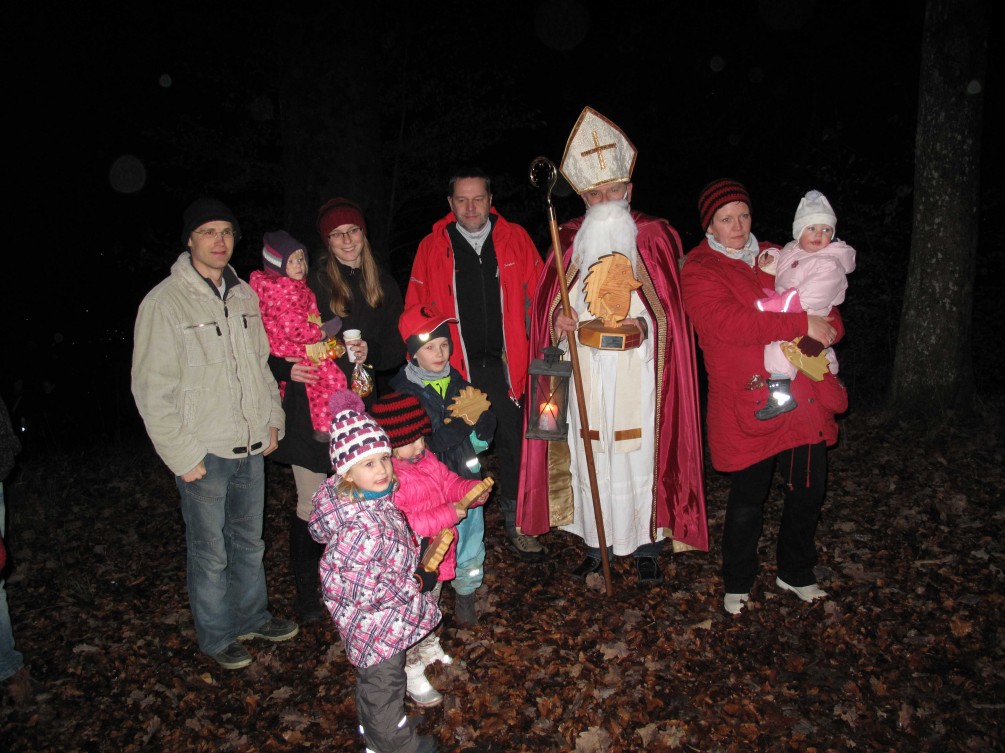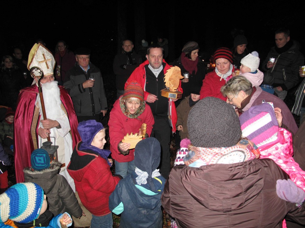 Der Wanderigel konnte es kaum fassen, über 60 kleine und große Wanderer trafen sich am Parkplatz an der Kreuzackerstraße und wanderten hinauf zur Helenenruhe, um dort den Nikolaus zu treffen. Auf dem Weg durch den Wald bot die Gruppe mit den Fackeln in der Dämmerung ein wunderbares, heimeliges Bild. Bei wunderbarer Aussicht hinunter auf das hell erleuchtete Sulzbach und ins Murrtal stärkte sich die Wanderschar zunächst einmal mit Lebkuchen, Kinderpunsch und Glühwein. Bald kam dann der Nikolaus den Berg herauf. Er hatte dieses Mal, anstatt einer modernen LED-Lampe, eine wunderschöne alte Laterne dabei, um den Weg zu finden. Der Anblick des Mannes im Bischofgewand mit Bischofsstab und Bischofsmütze war dem einen oder anderen kleinen Wanderfreund zunächst nicht ganz geheuer. Das änderte sich aber rasch, als der Nikolaus vor allem die Kinder herzlich begrüßte. Nach einem von Groß und Klein gesungenen Nikolauslied erhielt jedes Kind ein kleines Geschenk. Einige Kinder trugen dann zur Freude aller Anwesenden dem Nikolaus noch sehr schöne Gedichte vor. Anschließend wurde der “Familien-Wanderpokal“ für die häufigsten Teilnahmen an den diesjährigen Familienwanderungen überreicht. Mit der Fam. Bacher aus Sulzbach (Patrick, Marie & Lena mit Mama Nicole und Papa Thomas) der Fam. Rau aus Murrhardt (Laura & Julia mit Mama Jana und Papa Michael) gab es dieses Jahr wieder zwei neue Gewinner. Patrick Bacher (7 Jahre alt) erhielt außerdem ein kleines zusätzliches Präsent für seine tolle Leistung bei der Familienradtour im Oktober. Nach und nach machten sich danach die einzelnen Familien auf den Heimweg. Beim „6-Uhr-Läuten“ der evangelischen Kirche erreichten die letzten Teilnehmer gemeinsam mit dem Nikolaus wieder den Parkplatz.